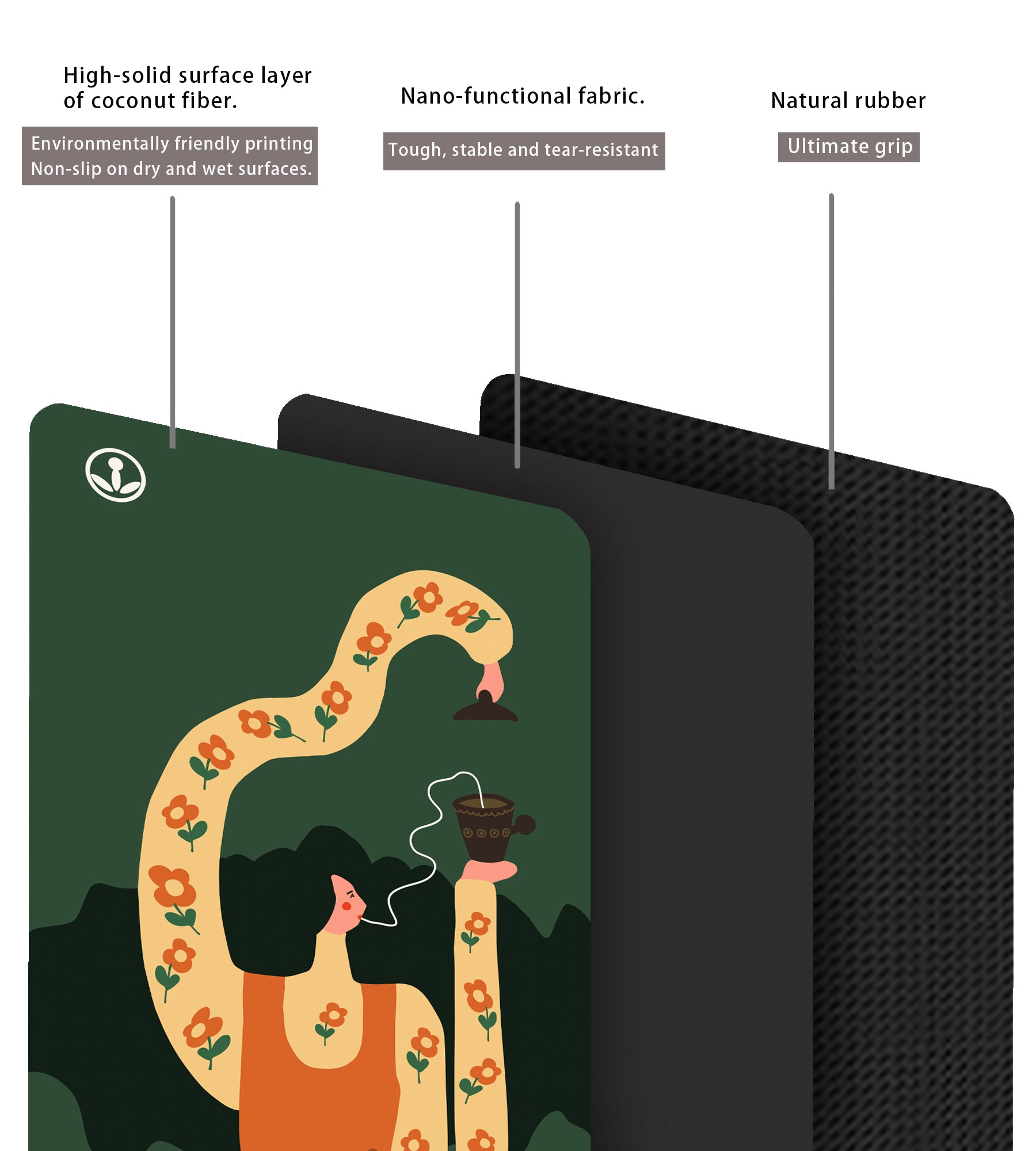 Our material is the top grip and wear-resistant on Earth. The innovative design stacks coco natural rubber and our specially designed unique (don't accept cheap imitations!) non-toxic ecological polyurethane to provide the most stable and comfortable practice surface. There is no need to worry about losing balance or slipping. We have achieved a perfect balance between durability and highly efficient biodegradability at the end of service life, meeting all requirements: comfort, stability, durability, environmental protection, body-fitting, very beautiful and absolutely grippy.
