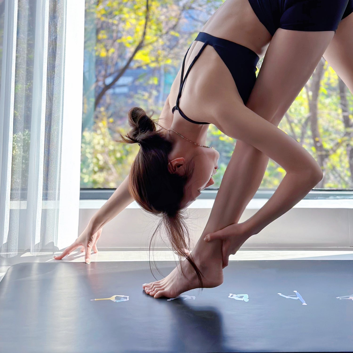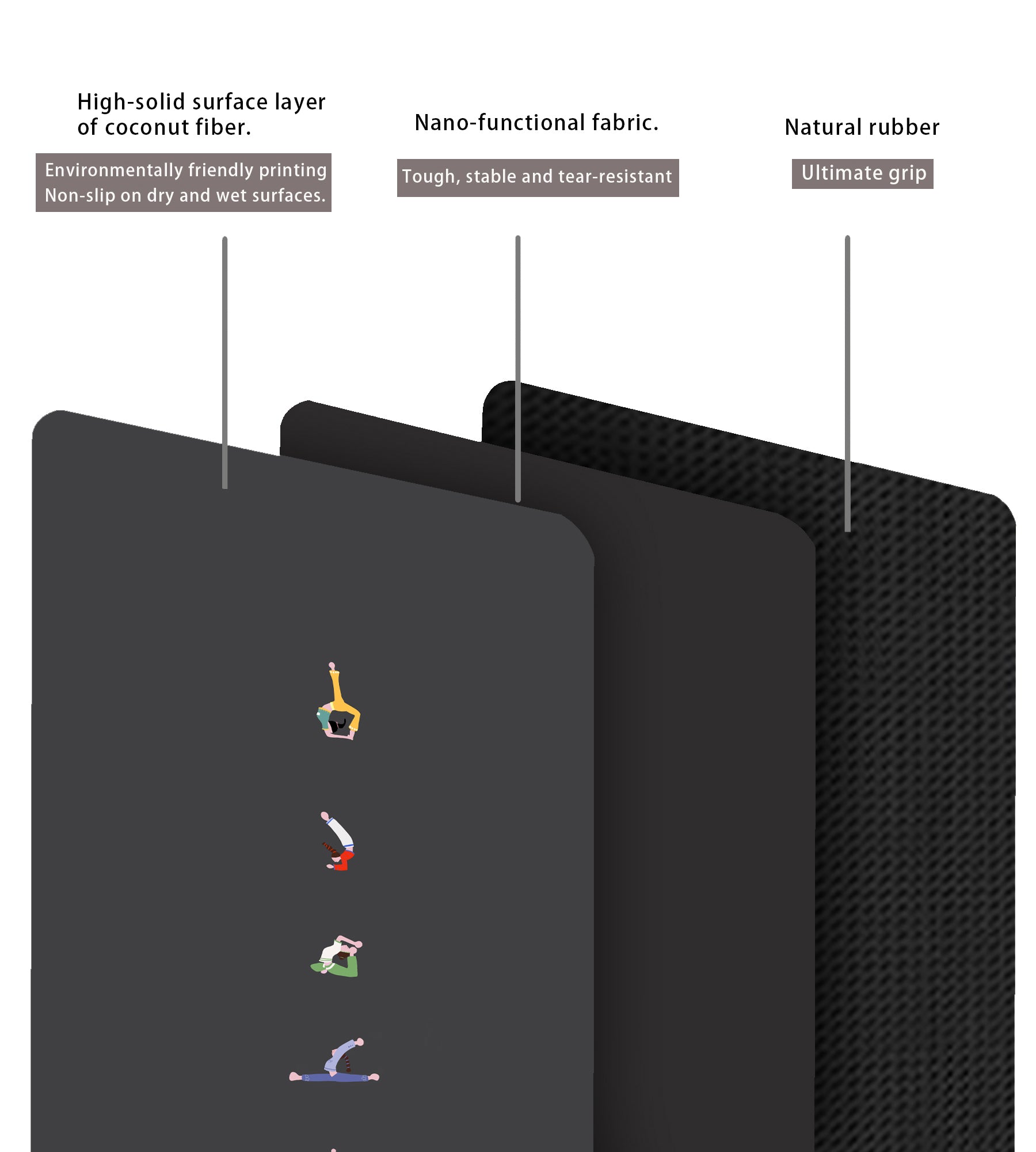 Our material is the top grip and wear-resistant on Earth. The innovative design stacks natural rubber and our specially designed unique (don't accept cheap imitations!) non-toxic ecological polyurethane to provide the most stable and comfortable practice surface. There is no need to worry about losing balance or slipping. We have achieved a perfect balance between durability and highly efficient biodegradability at the end of service life, meeting all requirements: comfort, stability, durability, environmental protection, body-fitting, very beautiful and absolutely grippy.